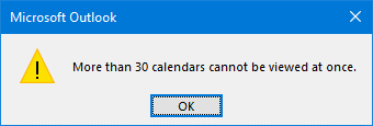 - A warning window will pop up to let you know that “More than 30 calendars cannot be viewed at once.” Click OK to continue.