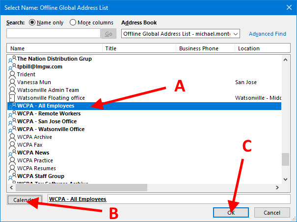 - Find the “WCPA – All Employees” group in the Offline Global Address List.