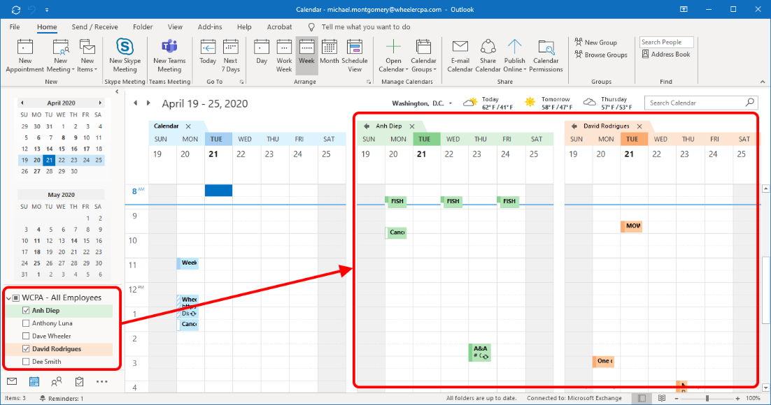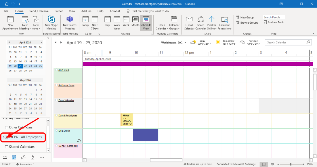 - Whenever you need to add or remove an employee’s calendar to your Calendar view, simply follow step #9 to select a calendar or deselect a calendar from the WCPA – All Employees calendar group.