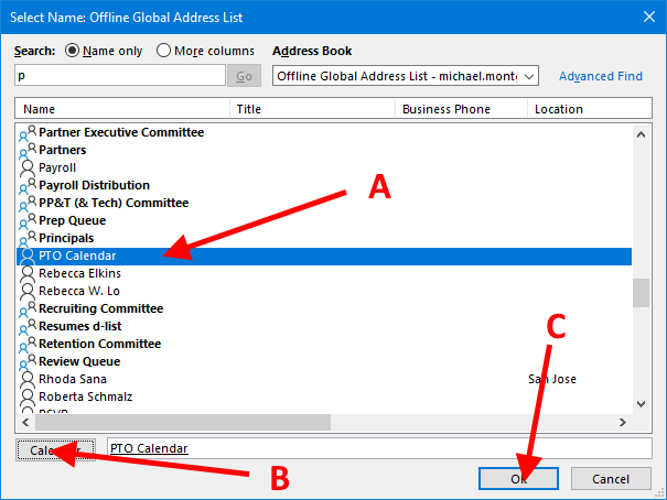 In addition to the Staff Outlook Calendars, you may also be interested in viewing the PTO Calendar. This is opened in the same way that the Staff Outlook Calendars are opened.
