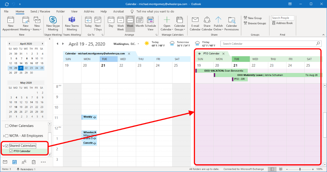 - The PTO Calendar now appears next to your own calendar in Outlook.